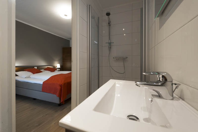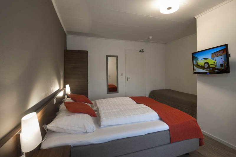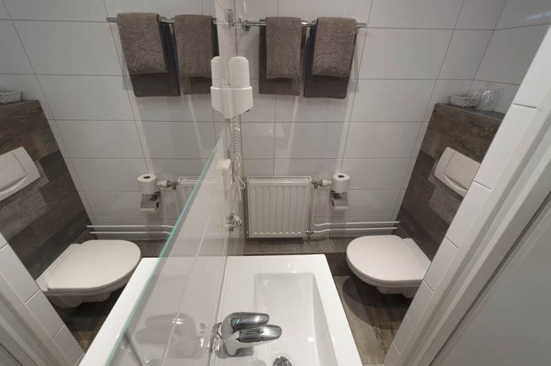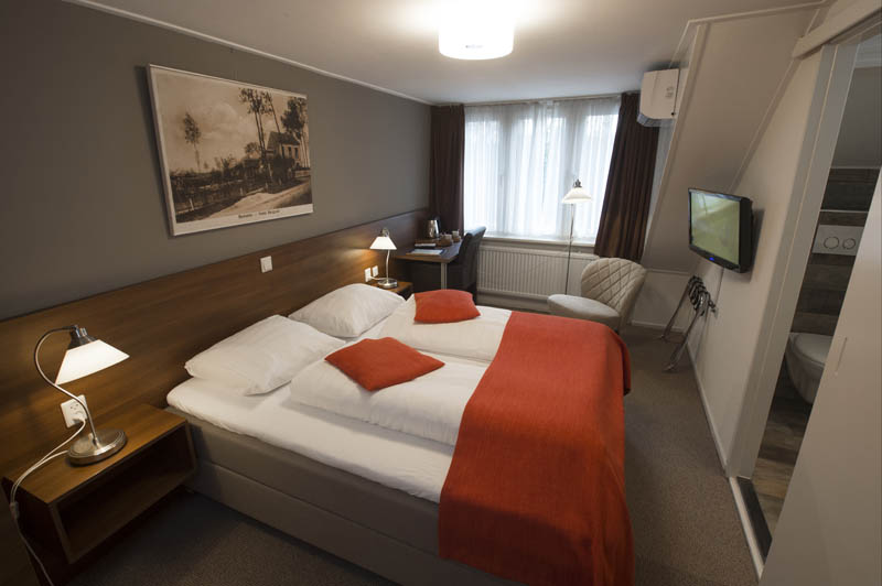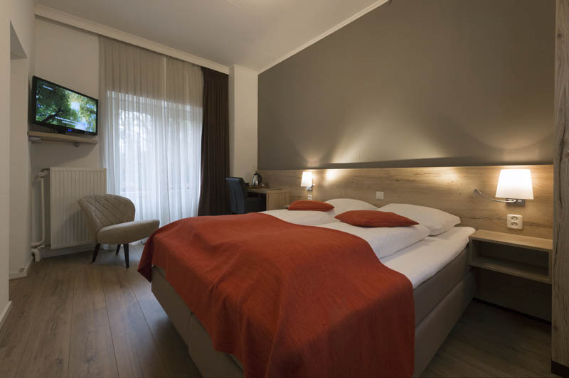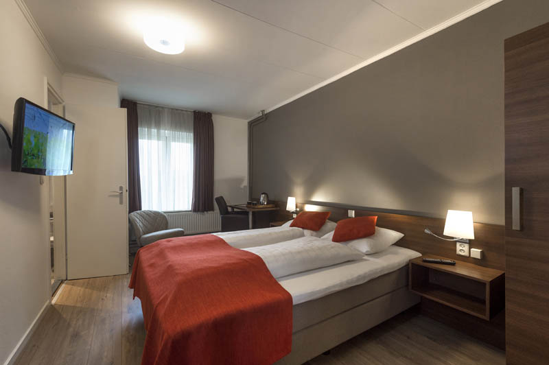 De hotelkamers beschikken over 2 boxsprings bedden 80/200 die naast elkaar staan, een gerenoveerde badkamer met douche, wc en wastafel.